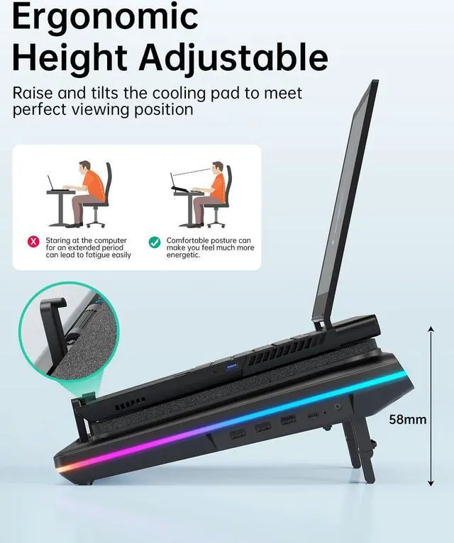 [User-Friendly Design]With 1 in 3 out USB Hub, you can connect keyboards, mouse and other devices, more convenient for you to use. Two non-slip baffle can prevent your laptop following down on slanting surfac. Adjustable Height helps to relieve neck pain caused by prolonged laptop use and incorrect posture