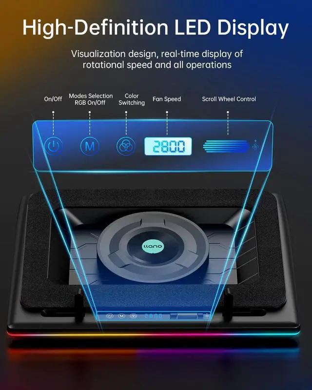 [HD LED Display + Touch Control Keys]Featuring a visual design, our laptop cooling pad offers real-time display of fan speed and lighting adjustments. With touch-sensitive buttons, you can easily select the desired fan speed, finding the perfect balance between cooling performance and noise levels