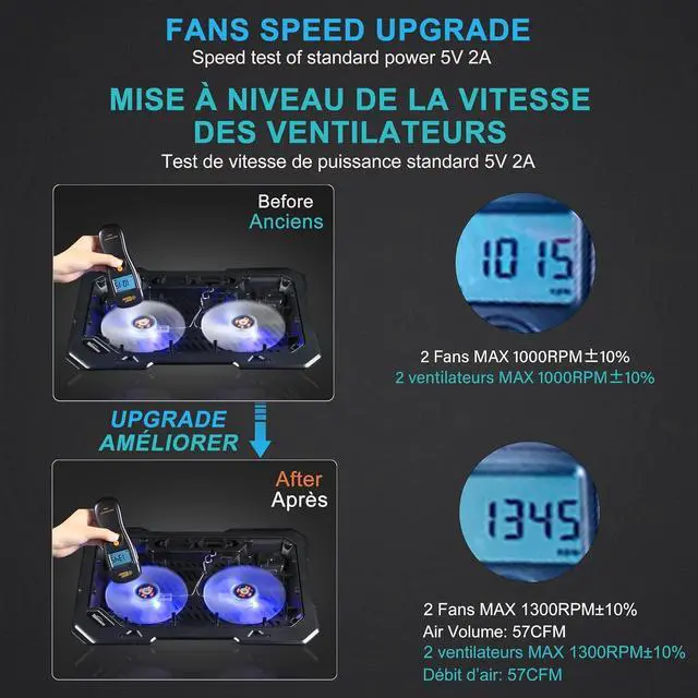 Speed Upgrade2 fans have upgraded the motor with a speed of 1300RPM, the cooler pad can bring more air volume and prevent the laptop router hub xbox ps4 ps5 from overheating.