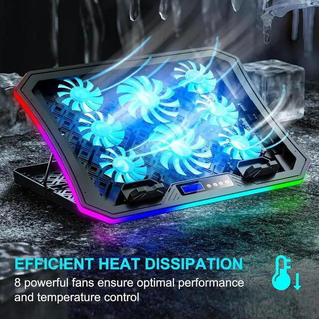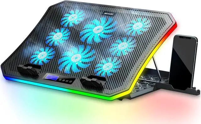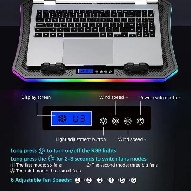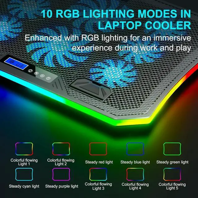 Craftsmanship Upgrade & 2 Years Warranty: The cooling base and shell, made of heat-resistant plastic, have a better texture and increased stability. The cooler for laptop is compatible with 11- 17.3 -inch laptops. It comes with 2 USB ports, without occupying laptop ports. Laptop fans equipped with a braided USB cable, it is not prone to loosening or detachment. Featuring an LCD display screen, it is simple and intuitive. You can easily control RGB lights, fan speed, and fan modes with the buttons.
