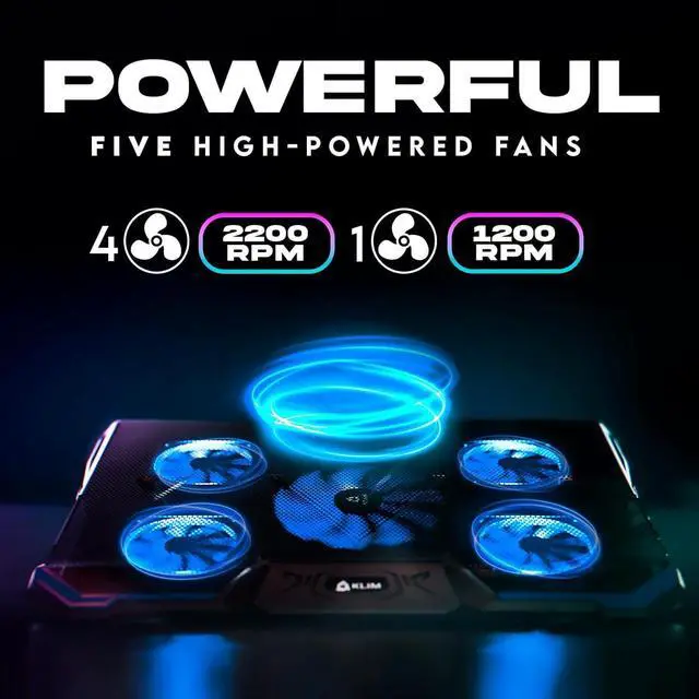 THE MOST POWERFUL ON THE MARKET. He dethrones his older brother the KLIM Wind. With 4 fans rotating at a speed of 2200 RPM + 1 fan et 1200 RPM you wont find anything more powerful? Its a high performance cooling pad with the ability to cool down your laptop to a reasonable temperature under a minute. Its 5 fans allow the KLIM Cyclone to cool down every single area of your laptop.