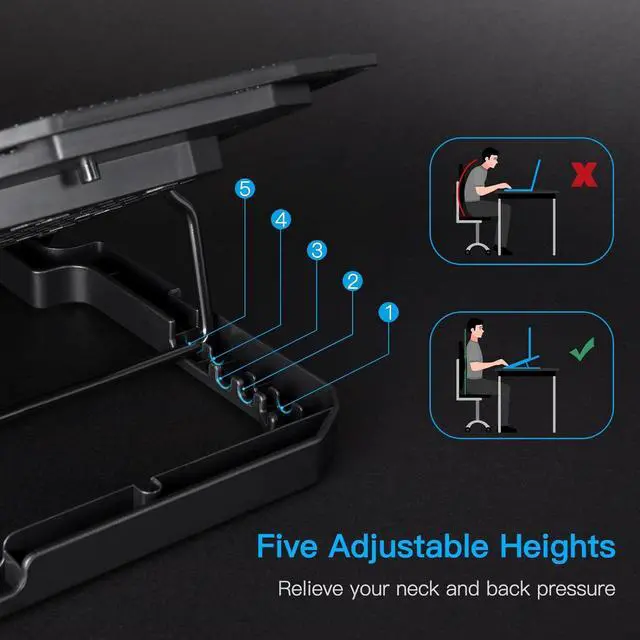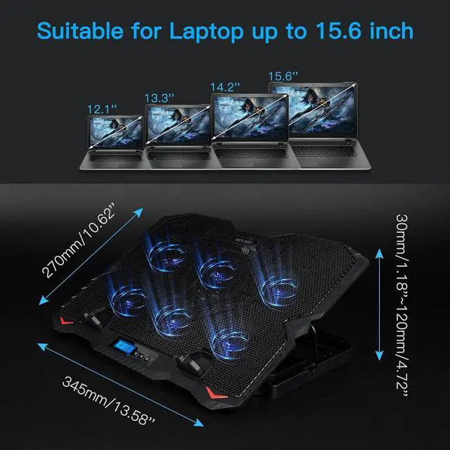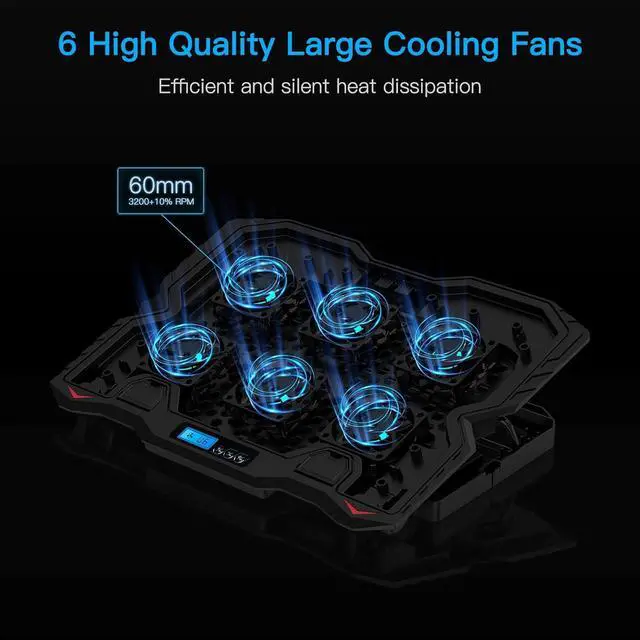 Adjustable Fan Speed & Cooling Pad HeightOur laptop cooling pad 6 fans can work together, or 3 fans work individually, two independent switches control the fan speed from 1 to 6 gears. The laptop cooling stand has 4 heights for you to choose from and can be adjusted freely to fit different laptops.