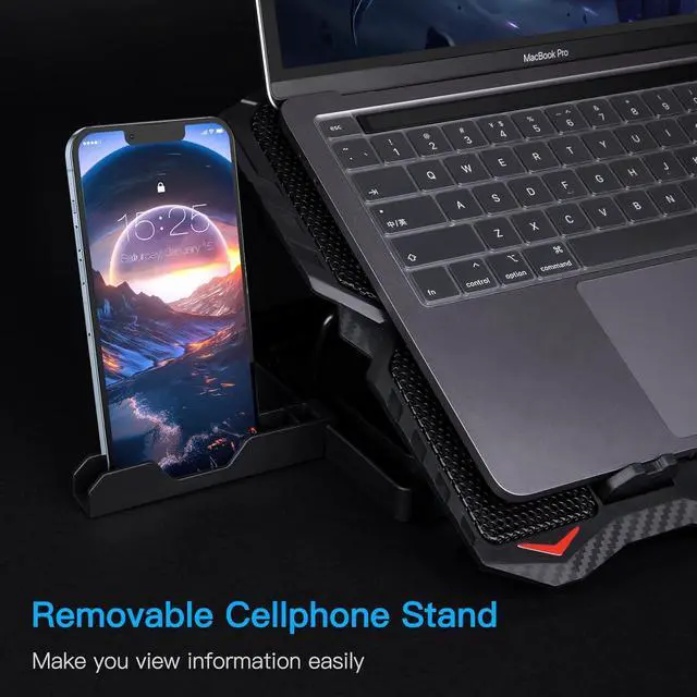 Mobile phone stand & non-slip baffle design Trakxy gaming laptop cooling pad with mobile phone stand design, allows you to use your computer while you can also place your phone. Two anti-slip baffles can prevent your laptop from moving down on the tilted surface. At the portable laptop cooler bottom, there is also a thickening anti-slip pad, keeping a laptop stable.