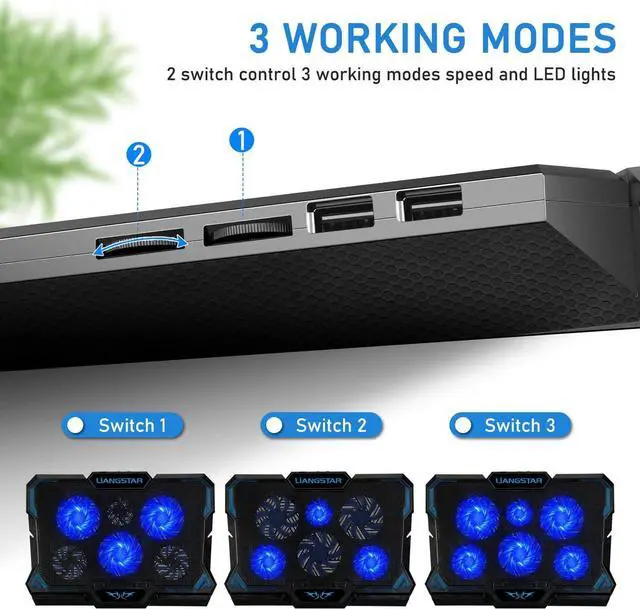 Adjust Fan Speed & Cooling Pad HeightOur laptop cooling pad 6 fans can work together, or 3 big fans and 3 small fans run separately, two separate switch control fan speed from 0 to max freely. The pad have 2 height for you select, free adjust suit different laptop.