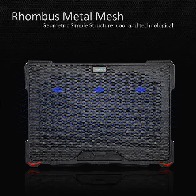 This gaming laptop cooling pad can accommodate laptops up to 17.3". The laptop chill desk has a large central fan with two smaller fans on each side (5 total fans). The upper surface is covered in meshed metal with the bottom and sides being plastic