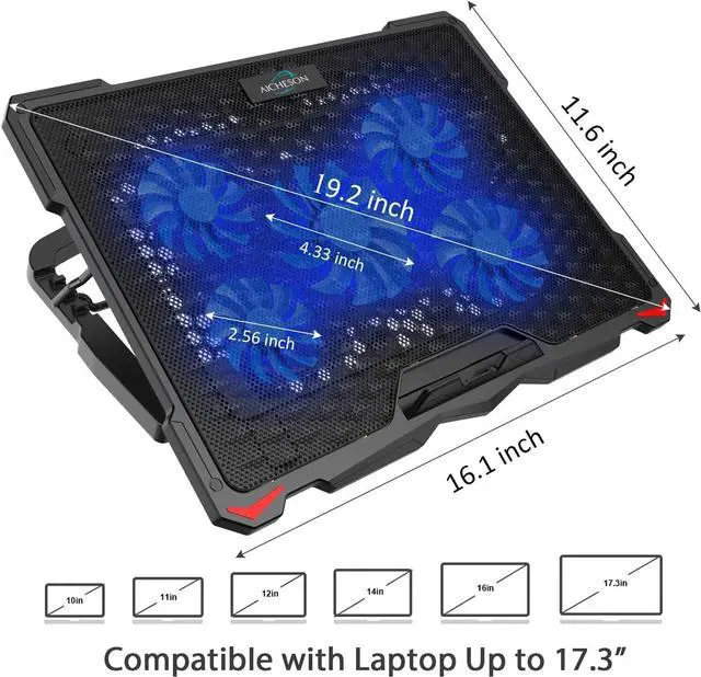 AICHESON S035 laptop cooler is special designed to cool down up to 17.3 inch laptop. Wave metal mesh, 1000-1500RPM 1 big fan 4 small fans, flip-up silicone holder, 4 adjustable stand height settings, 2 USB ports, adjustable speeds, foam pad