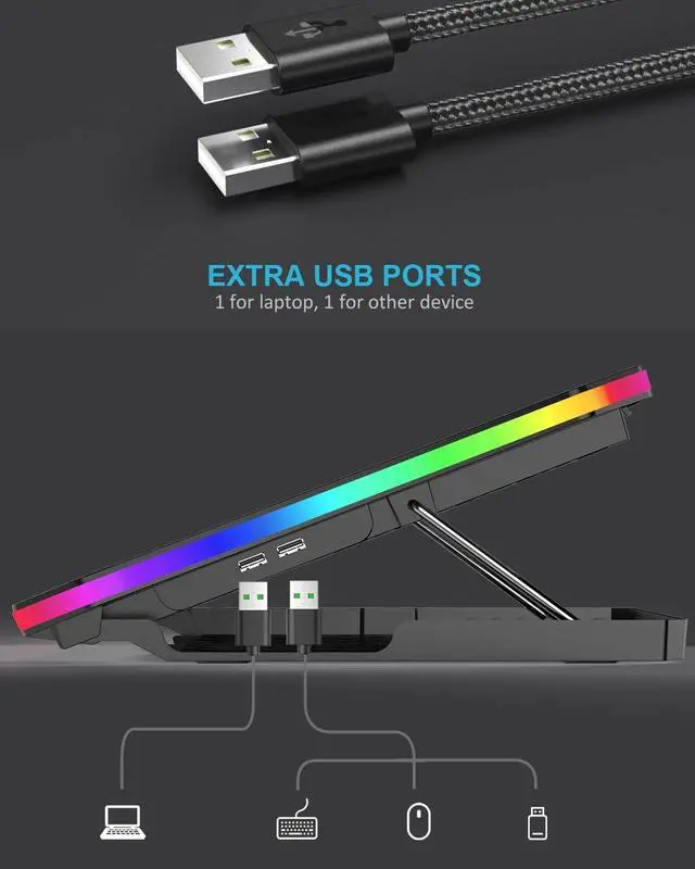 Ergonomic Height Stands - This rgb light cooling pad for a laptop has 7 different height settings, which allows you to adjust a comfortable posture from 16 degrees to 35 degrees, raising your laptop 4.3" to 7.5" high. Weighs 2.57 lb, it is lightweight to carry with you. Relieve pain your shoulder and spine, guide you a healthy lifestyle