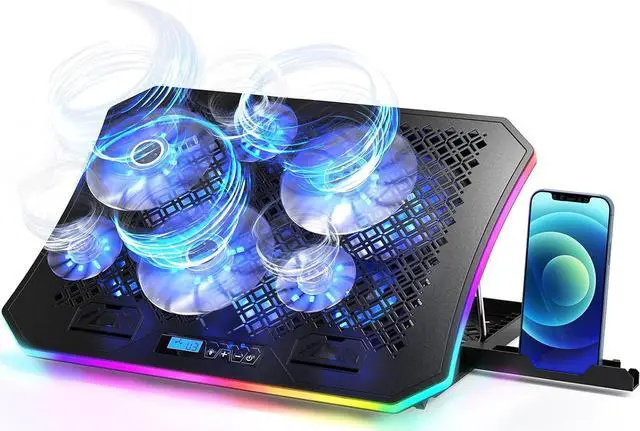Efficient Heat Dissipation - Structured with geometry and big hole metal panel, 3 big cooling fans and 3 small fans with blue lights, the laptop cooler pad will deliver an impressive amount of cooling while still remaining quiet to boot. LCD display screen allows controlling rgb lights, fan speed and modes