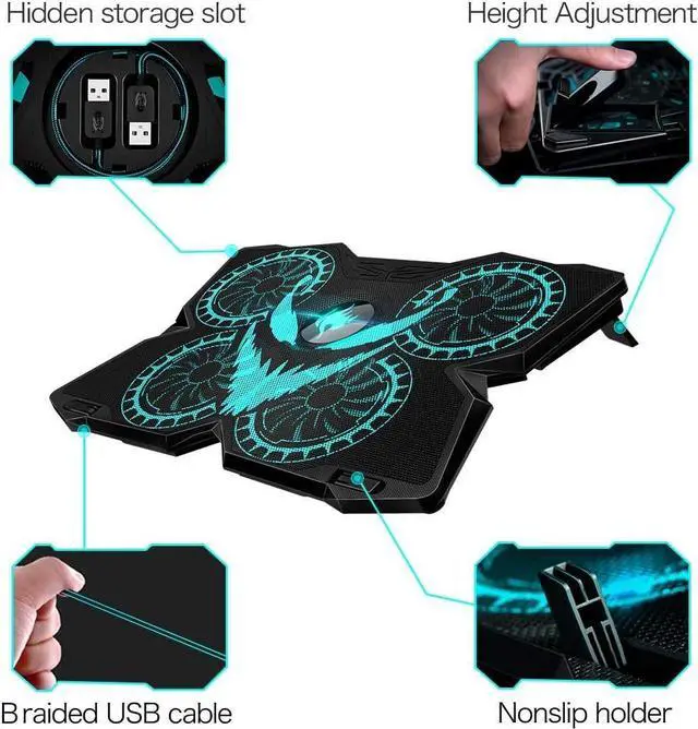 Unique 5 Height Stands & Phone Holder DesignOur cooling pad provide 5 height for you select, free adjust suit different laptop. Unique phone holder stored on the right side of the laptop cooler base, can conveniently put your phone in cooling pad to view information easily.