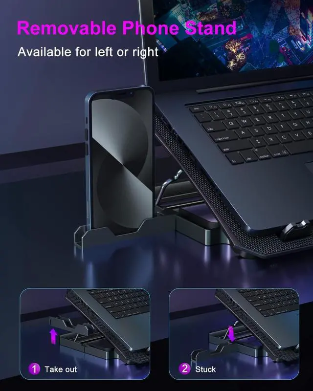 Ergonomic Height StandsFive adjustable heights desigen to put the stand up or flat and hold your laptop in a suitable position. Two baffle prevents your laptop from sliding down or falling off; It's not just a laptop Cooling Pad, but also a perfect laptop stand.