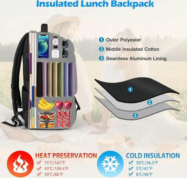 Durable & ComfortableThe top-quality outer polyester material ensures the durability and longevity of this lunch backpack laptop. The waterproof backpack is featured with SBS zipper which has passed the test of 50000+ times of pulling and closing, providing smoothness without stucking. The padded units on the back and shoulder straps of the cooler backpack for travel are extremely breathable and soft, not only offering you with maximum back support to relieve, but also reducing your sweating.