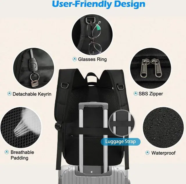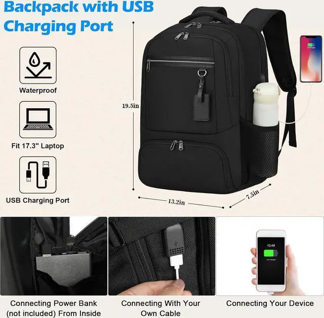 Convenient DesignThe laptop backpack men women with USB charging port and cable can be used for charging various electronic devices like phone and tablet on the go. And please note that you need to use your own power bank. The detachable keyring inside the front pocket of this black lunch backpack keeps your keys well-organized, and youll no longer worry about finding the keys. The luggage belt can be used to place the backpack on the trolley when you are tired, making your trip easier.