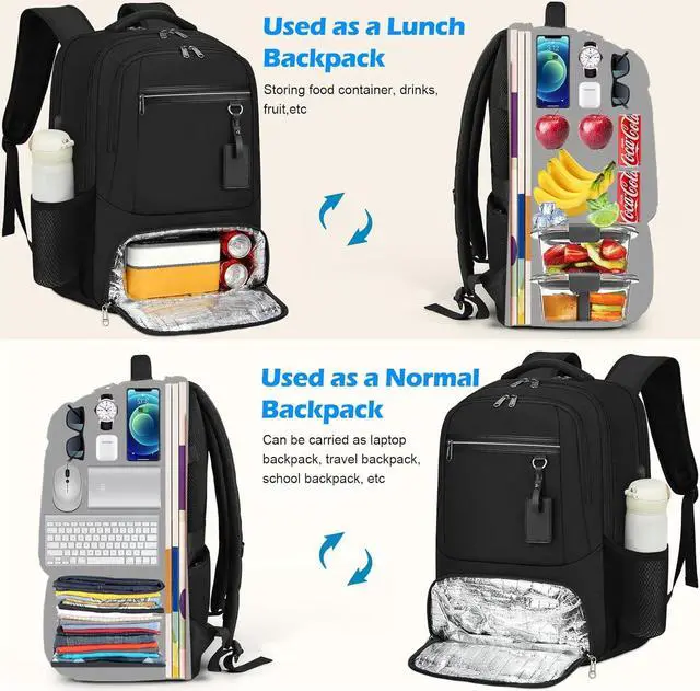 Large Capacity & Multiple PocketsThe cooler lunch backpack with roomy compartment will accommodate your daily carrying and meal needs easily. The main compartment of the lunch backpack can hold various belongings. The laptop compartment can fit your 17.3 inch laptop and 12.9 inch iPad. Two front zippered pocket can keep some extra stuff for saving space of other compartment. Besides, there are two side mesh pockets, backpack anti-theft pocket and meal compartment of this insulated backpack.