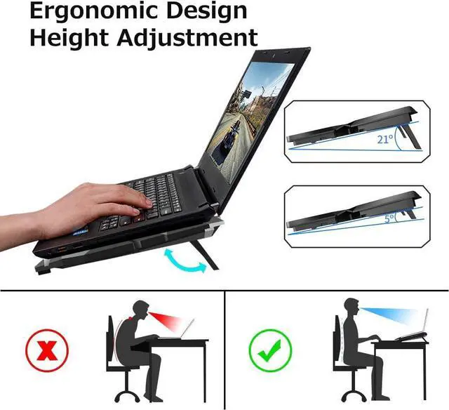Ergonomic Design & Non-Slip BaffleLaptop cooling pad with ergonomic design is comfortable in all-day using. Laptop cooler stand can be hidden when you dont use it. Two non-slip baffle can prevent your laptop following down on slanting surface. Also have enlarged and thickened anti-skid pad at the bottom keep laptop stable.