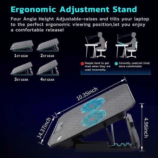 Ergonomic StandBuild with non-slip baffle, effectively prevent laptop slipping off. Equipped with ergonomic stand and 5 level adjustable height setting to help you to get the most comfortable angle when playing games, watch videos or doing work for all-day reviewing.