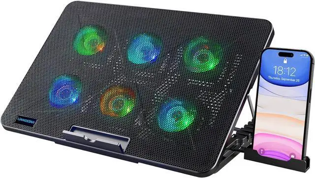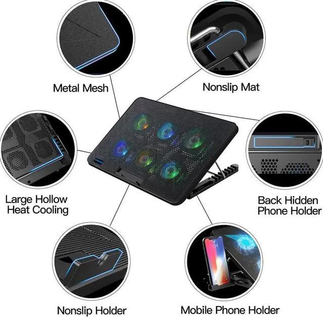 Unique 7 Height Adjustable & Phone Holder Design The cooling pad have 7 height for you select, free adjust suit different laptop. Unique phone holder stored on the left side of the laptop cooler base, can conveniently put your phone or tablet in cooling pad left or right to view information easily.