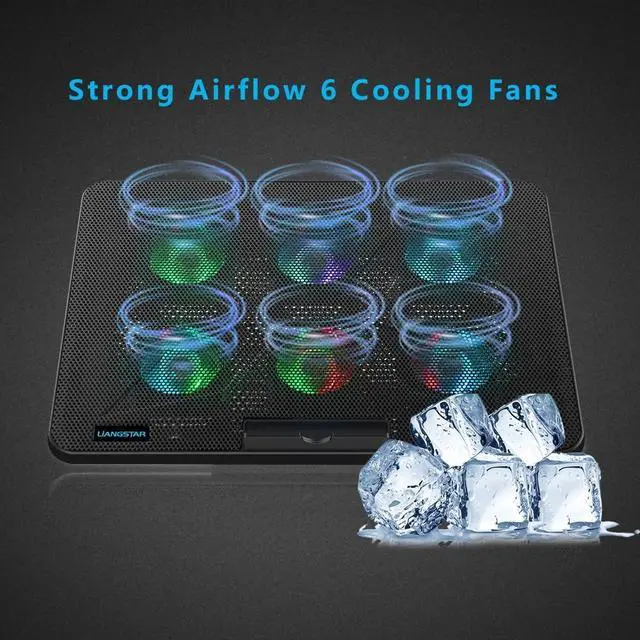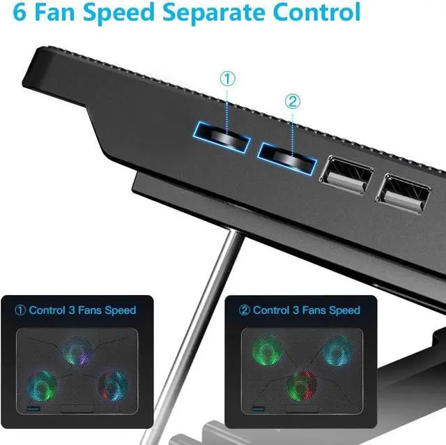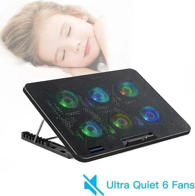6 Ultra Quiet Fan & 7 Color Light & Adjust Fan SpeedThis special laptop cooler with 6 ultra quiet fans, with 7 changing light colors, not only beautiful but also show fan is working. Our laptop cooling pad 6 fans can work together, or 3 fans run separately, two separate switch control fan speed from 0 to max freely.