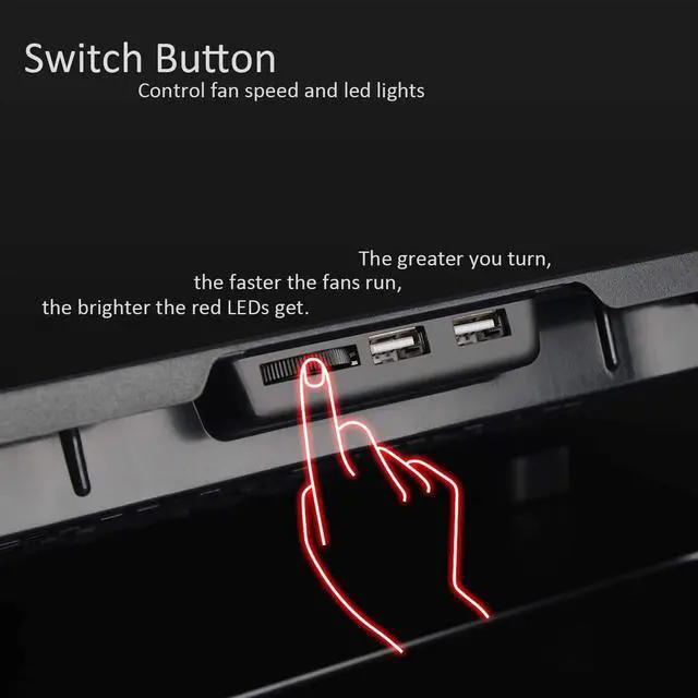 Two USB ports and a switch that turns fans and lights on and off (The greater you turn, the faster the fans run and the brighter the red LEDs get). A USB-to-USB cord (approx. 1.5 ft) is provided to connect the laptop to the computer cooling pad for power