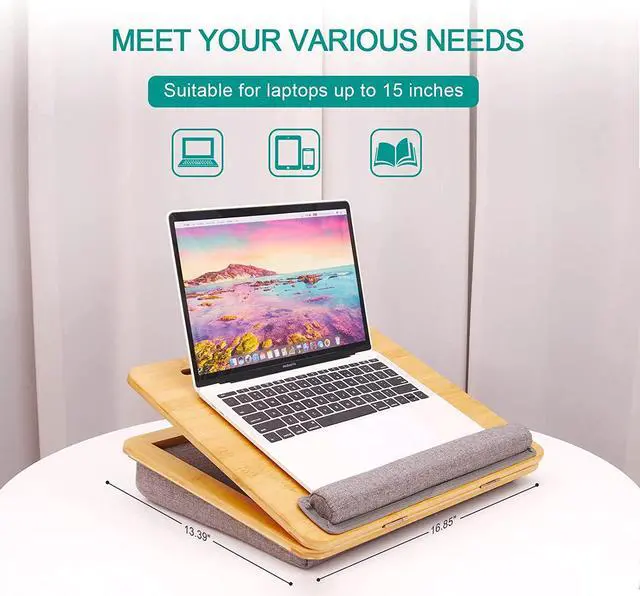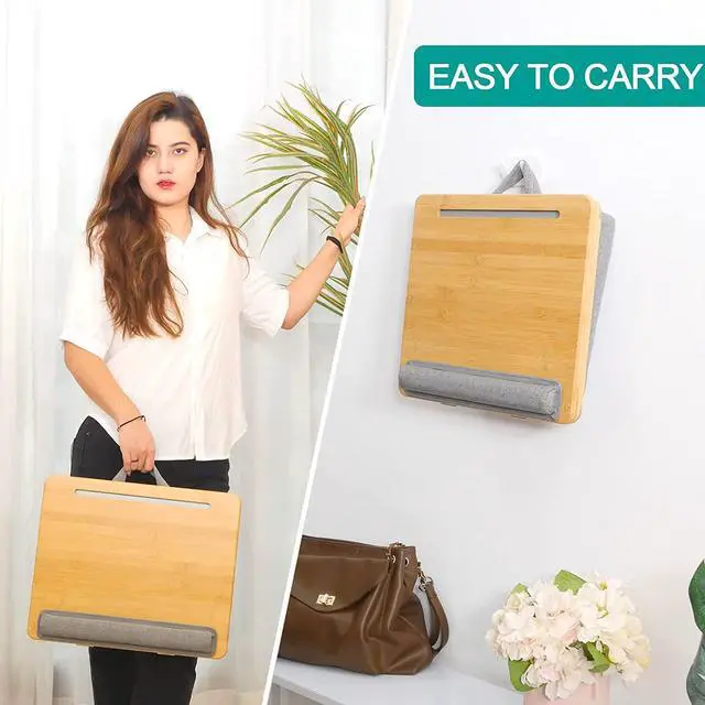 Dual Soft CushionThe wrist pad provides a comfortable place for your wrists while also preventing the laptop from slipping off the lap board. The pillow cushion is made of imitation linen, with excellent air permeability and appropriate softness. It fits perfectly atop laps and feels comfortable. The handle makes it more convenient to carry around