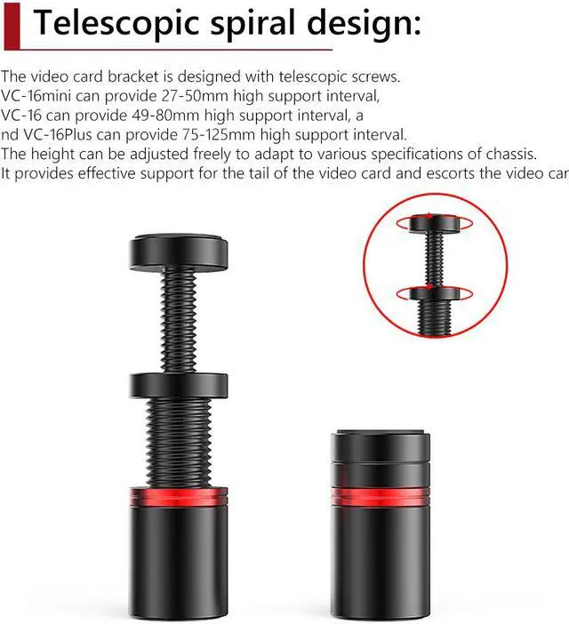 1. Telescopic spiral design: The video card bracket is designed with telescopic screws. VC-16mini can provide 27-50mm high support interval, VC-16 can provide 49-80mm high support interval, and VC-16Plus can provide 75-125mm high support interval. The height can be adjusted freely to adapt to various specifications of chassis. It provides effective support for the tail of the video card and escorts the video card.