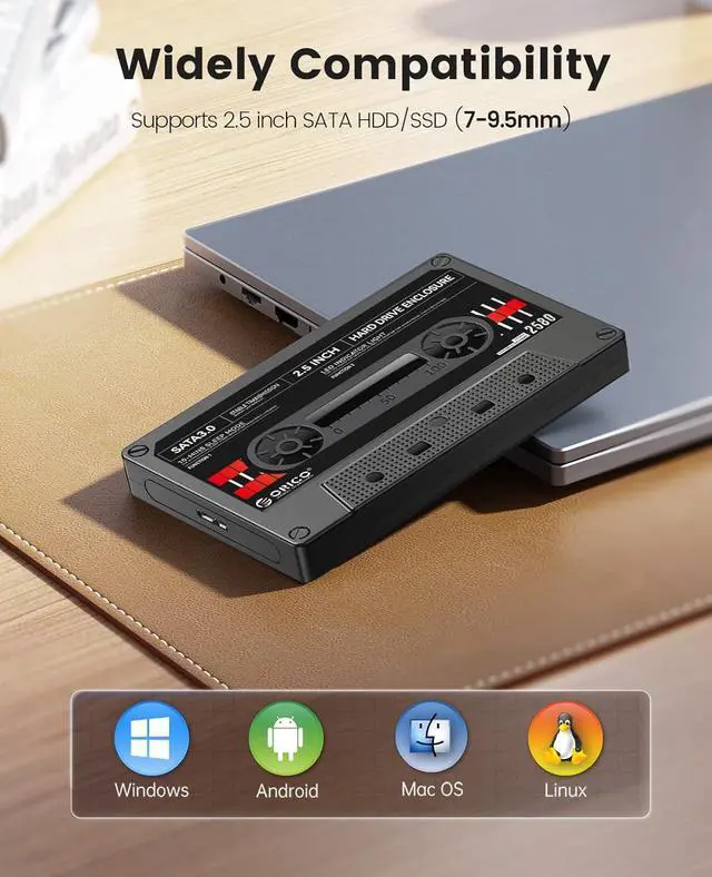 The orico sata enclosure 2.5 usb 3.0 with the vintage tape appearance, insert your hard drive in the enclosure, have the same function of the tape to storage music, even storage movies and photos, special and attractive. Suitable as a gift for friends and family, protable and at a glance to see the inside, convenient to use.