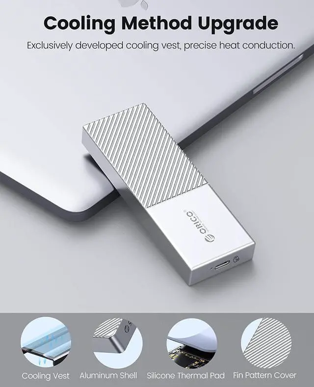 The all-aluminum alloy heat dissipation vest is professionally designed by ORICO and matched with silicone thermal pad, which can accurately conduct heat to the case shell and dissipate heat quickly.