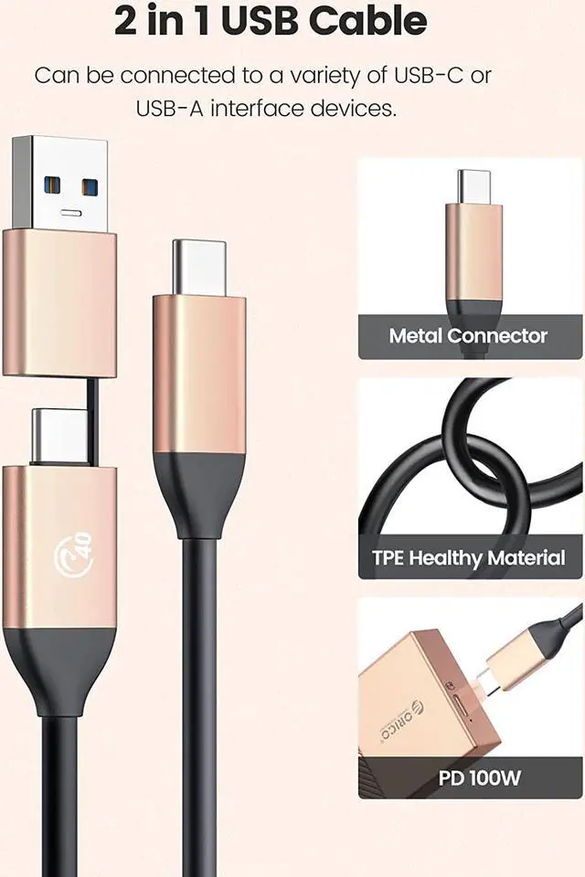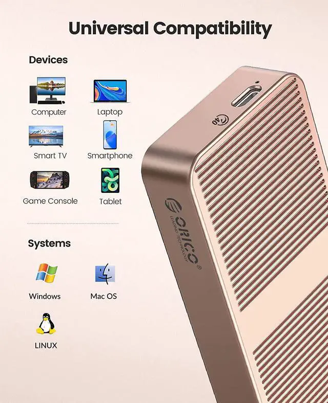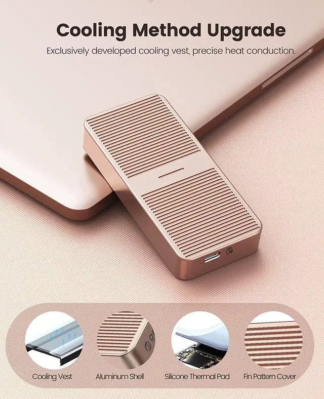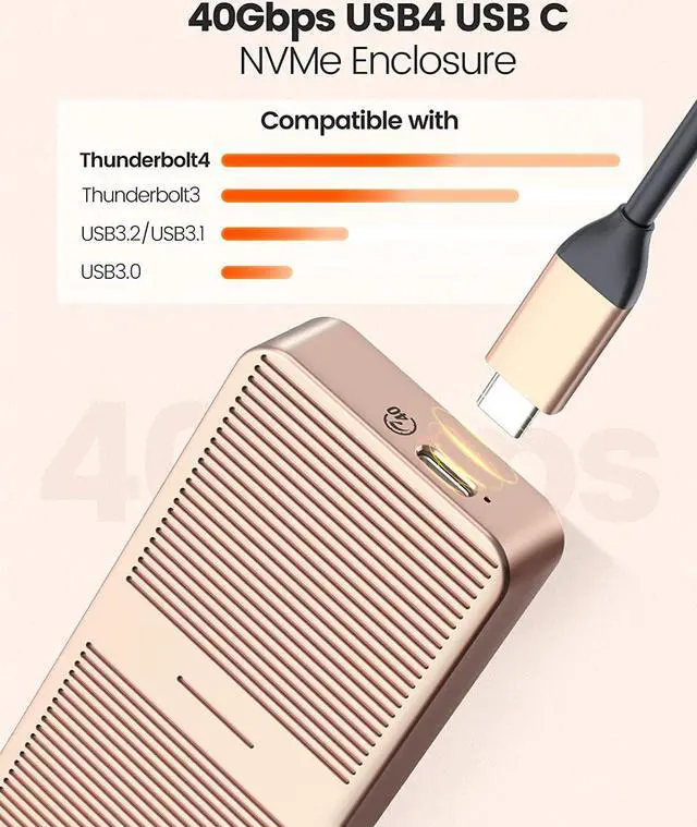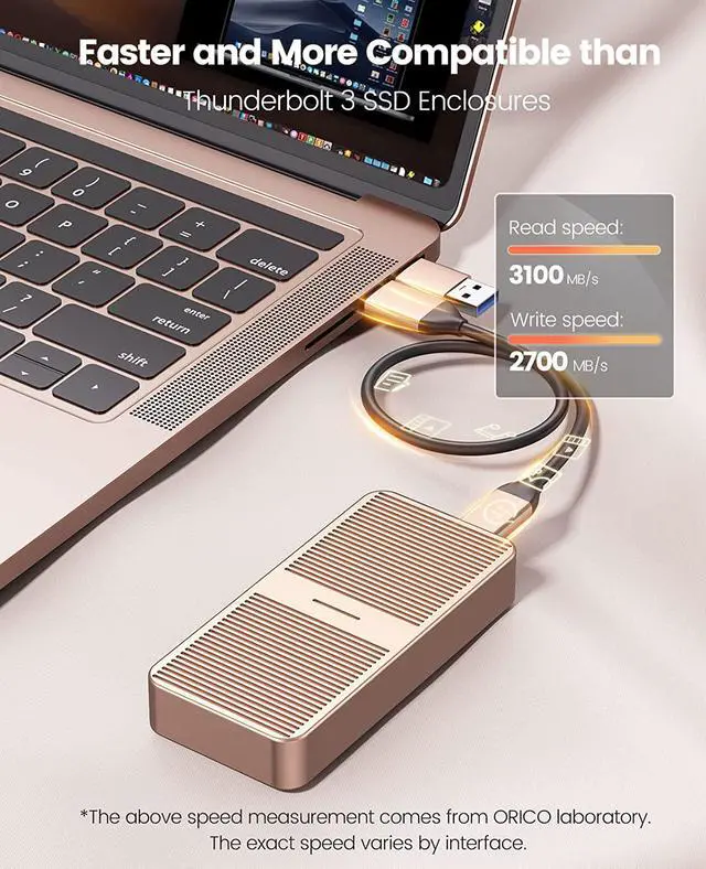 Using the latest version of the USB4.0 interface, the transfer rate is up to 40Gbps, and the theoretical reading speed can reach 2800MB/s. The speed measured by the ORICO laboratory: the ssd enclosure read speed: 2800MB/s, write speed: 2100MB/s. Actual transfer speed depends on SSD speed, type of USB port, computer performance, NVMe media used, etc.