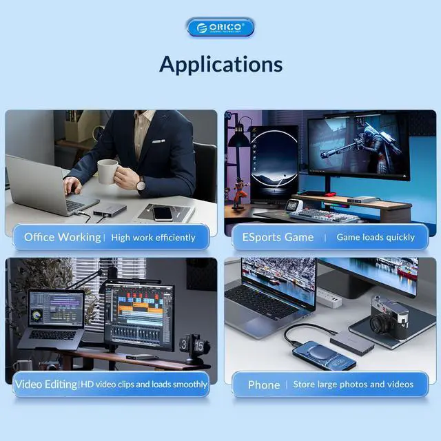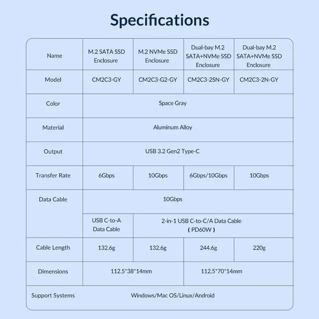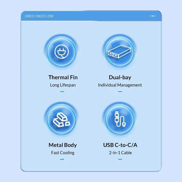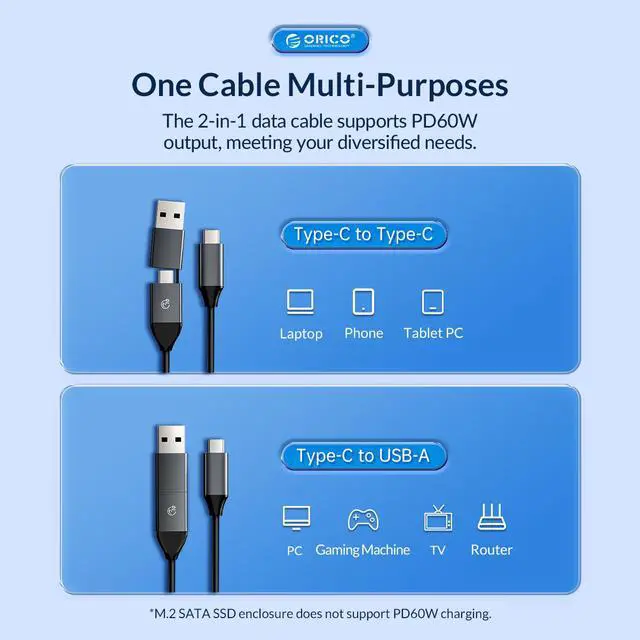 ORICO M.2 NVMe and SATA SSD Dual Bay Aluminum SSD Enclosure USB3.2 Gen2 10Gbps USB C for Dual Protocols SSD With USB C to C/A 2-in-1 Cable Support Up to 4TB SSD
