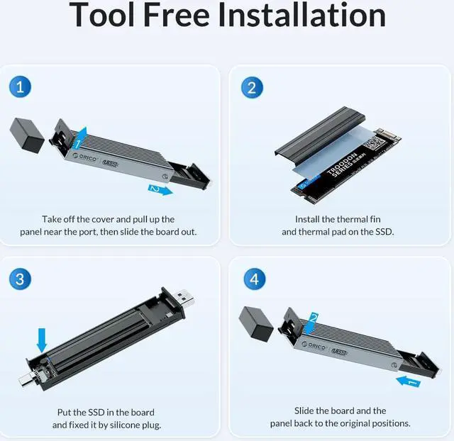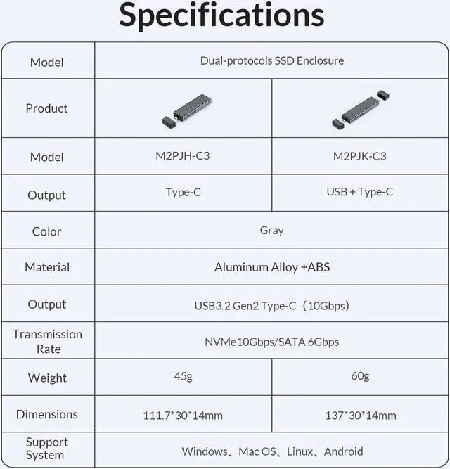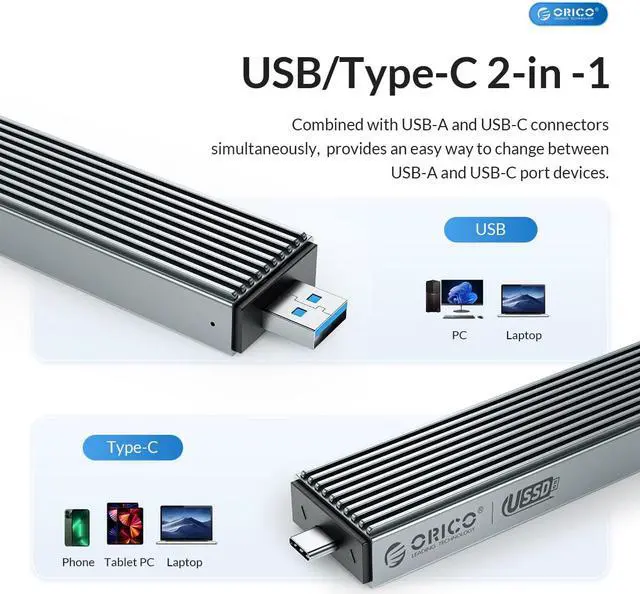 ORICO 2 in 1 USB A Type-C Dual Interface M.2 SSD Case Support M2 NVMe M Key SATA NGFF M&B Key SSD Hard Disk with Cooling Vest