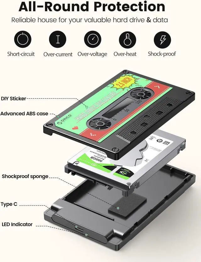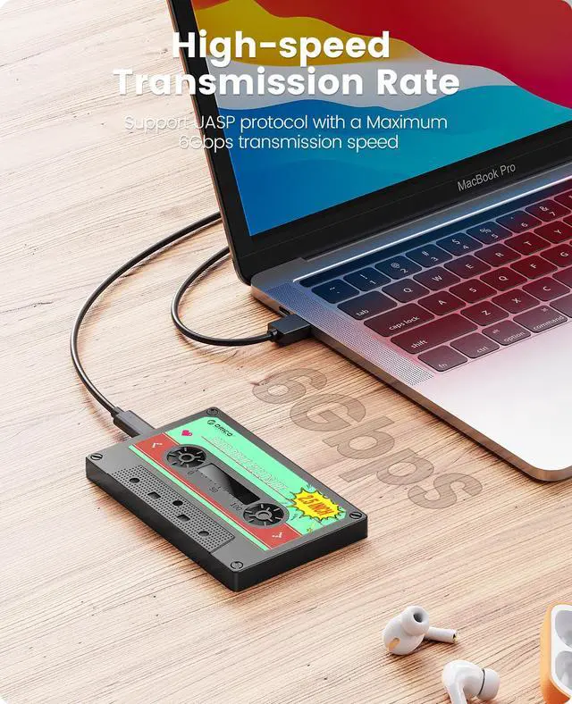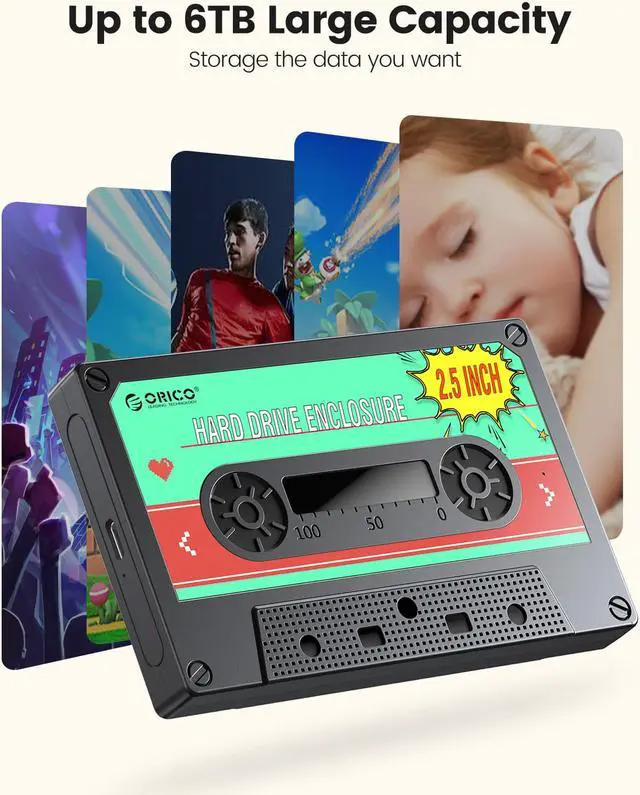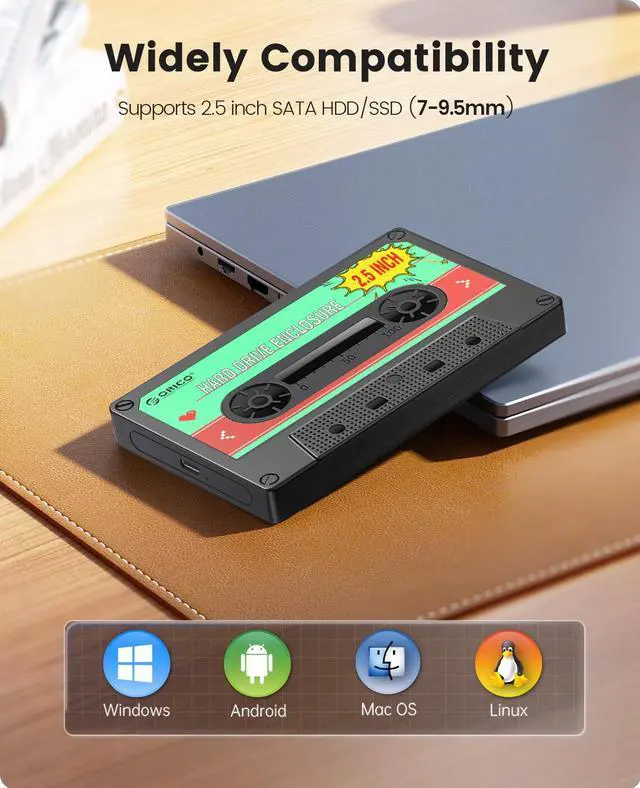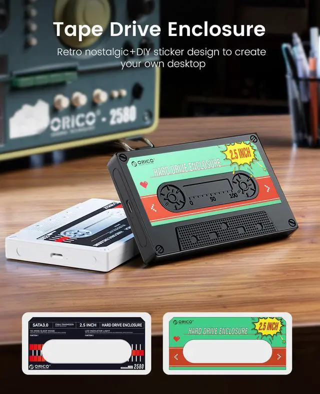 The orico sata enclosure 2.5 Type-C with the vintage tape appearance, insert your hard drive in the enclosure, have the same function of the tape to storage music, even storage movies and photos, special and attractive. Suitable as a gift for friends and family, protable and at a glance to see the inside, convenient to use.