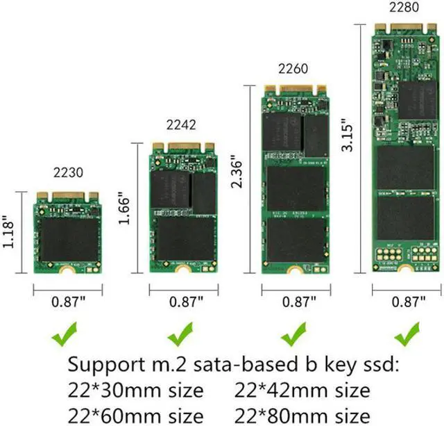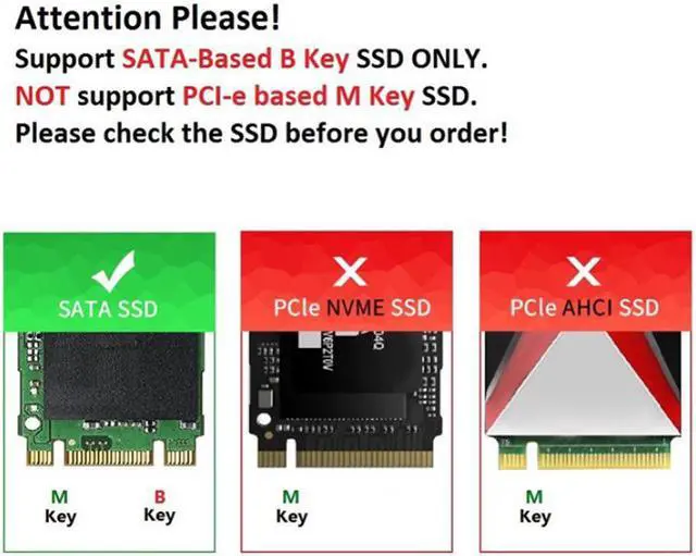 Compatible with SATA-bus NGFF M. 2 2280 / 2260 / 2242 / 2230 SSD with Key B/Key B+M ONLY.