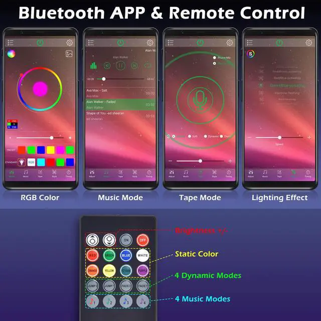 - Music Activated - 16 colors strip light with built-in sensitive microphone to pick up the sound and enable color changing dynamically with rhythm of music, ready to boost party ambience while bringing you an immersive visual-audio experience
