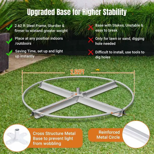 - Upgraded Cross Base for Stability - Features thickened cross-shaped metal base with a reinforced circle for strong and more stable support to the string light, along with ground stakes to firmly secure it to the lawn for fixed placement