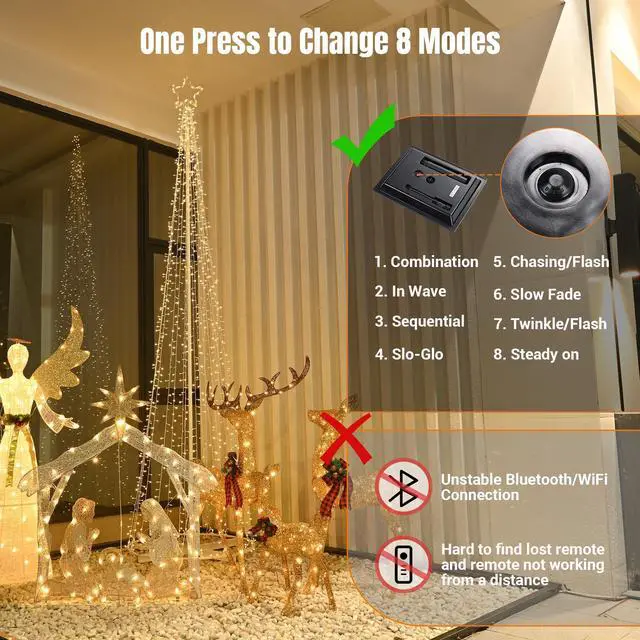 - Versatile Lighting Modes - Tailor the mood for any occasion with pre-set lighting modes including Combination, In Wave, Sequential, Slo-Glo, Chasing/Flash, Slow Fade, Twinkle/Flash, and Steady on, allowing you to create memorable experiences for your guests