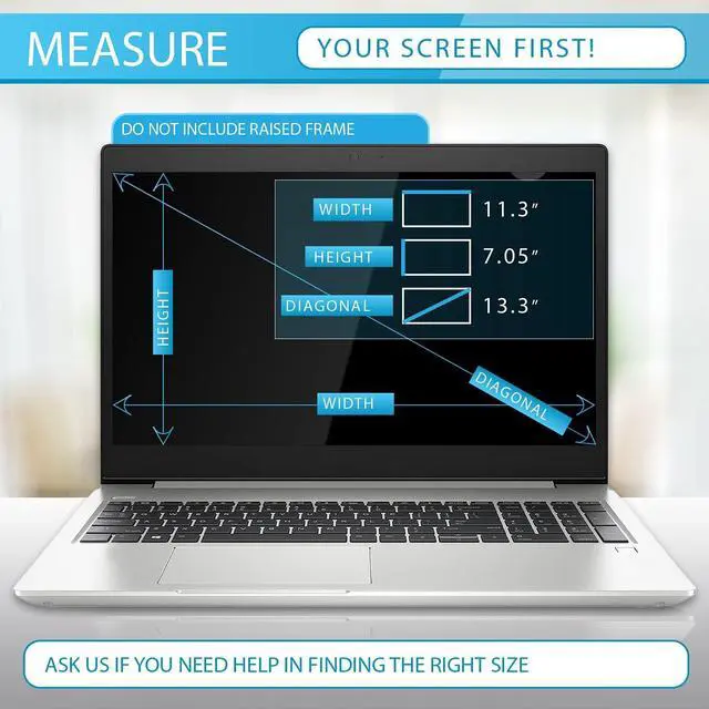 Actual Privacy Screen Filter dimensions are 13.3 inch measured diagonally. 11.3 inch width x 7.05 inch high. Compare your screen dimensions against our dimension before purchasing.