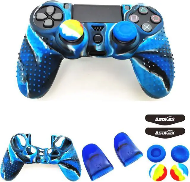 PS4 SKINS --Asokex anti-Slip silicone cover protector sleeve case only fit for PS4/PS4 Slim/PS4 Pro controllers, Easy install or remove, Scuffing prevent, Dustproof, Waterproof, Do not over-heating BUY CONFIDENCE --L2 R2 extenders do not need to use the super glueing for ps4 controller, Helps with trigger grip and ergonomics, increase the button response for games, Easy to clip on, not a trigger replacement, They fit good tight enough strong and stable DO NOT POP OFF --If you put your ps4 controller down to hard or hit em on sum, once you get it snapped into place it shouldn't fall off or pop off STYLISH LOOK --High resolution graphics and make your controller feels fashion cool, Really enjoying the extra comfortable they add to your ps4 controllers PACKING CONTENT --1pcs soft silicone case +1pair l2 r2 button trigger extenders + 4pcs humb stick grip cover+ 4pcs led light bar stickers, DO NOT include the game controllers
