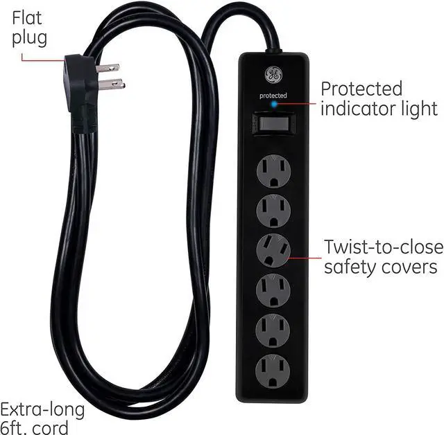 Expand your power 6 grounded and protected 3-prong outlets provide power from a distance perfect for creating a centralized hub for your electronics at your home, office, workshop or garage Versatile Cord 6ft. power cord housed in a durable PVC insulation and jacket with a space-saving flat plug to allow unit to fit closely to the wall. This surge protector extension cord is strong enough to last a lifetime and pliable enough to easily fully extend Protection 800 Joules protection rating safeguards your electronics from harmful voltage spikes. Integrated circuit breaker cuts power to your surge protector should it experience overvoltage or overheating Functionality Twist-to-close safety outlets ensure that dust and foreign objects are kept out of unused outlets.