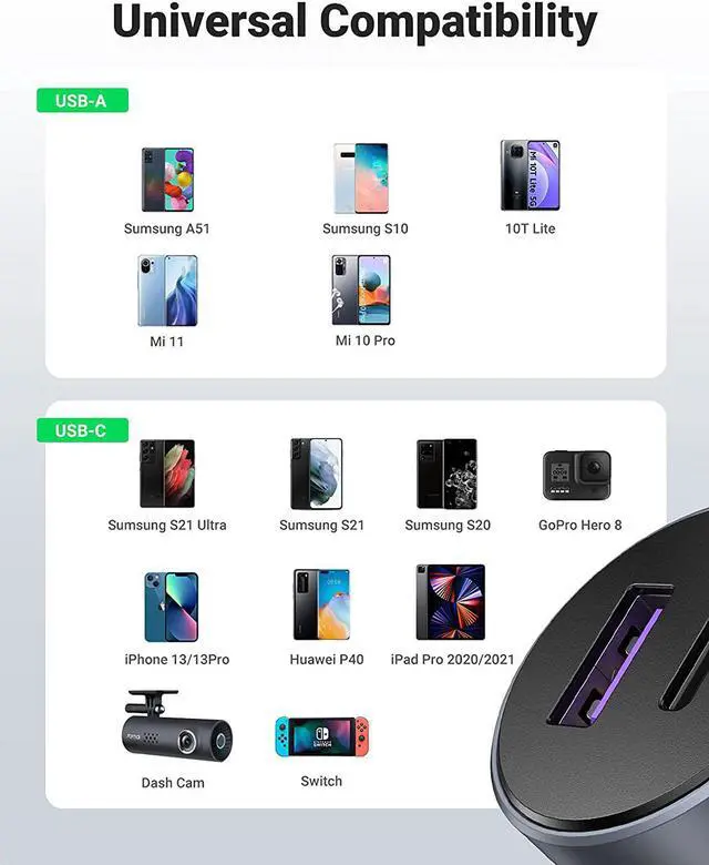 Universal Compatibility: The Car Charger Adapter is compatible with iPhone 13/12/11/11 Pro/XR/XS/XS Max/X/8/8 Plus/7/7 Plus, Samsung Galaxy S21/S20/S10/S10+/Note 10/Note 10 Plus/Note 9/Note 8/S8 Plus/S9 Plus/S8/S7/S6 Edge, LG V30/G6/G5/V20/G7, Pixel 4/4 XL/3a XL/3/3 XL/2/2 XL, Sony XZ Premium/Xperia, HuaweiI Mate 30 Pro/Mate 30/P10 Pro/Mate 20 Pro/P30 Pro/P20/P20 Pro, Xiaomi Mi 6/Mi 6X (Mi A2) /Mi 8/Mi 8 lite/Mi Pro/Mi 8 Se/Mi 9 Se/Mi 9/MIX 2/MIX 2S/MIX 3/Mi Note 3,tablets, TomTom satnav, Garmin Fast Charging 2