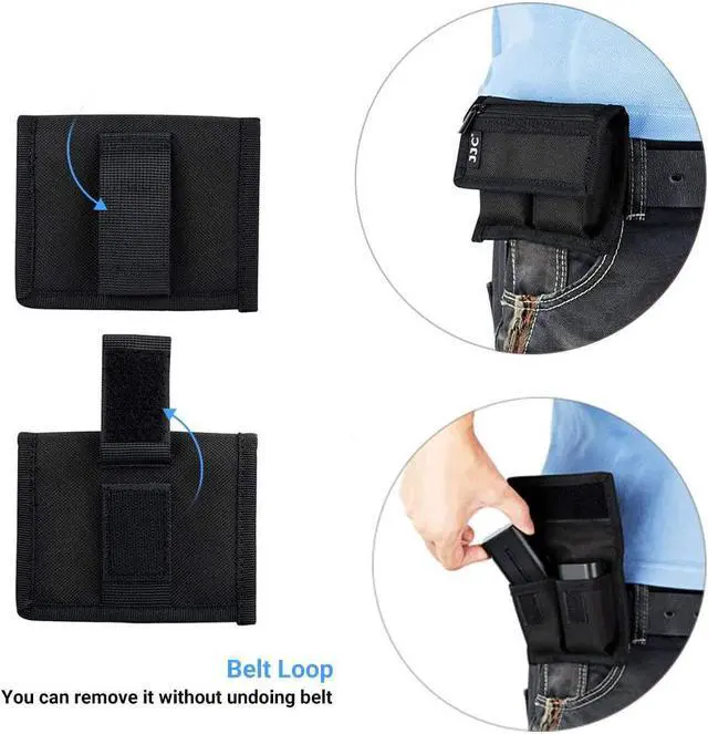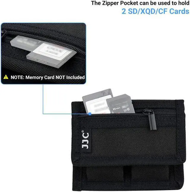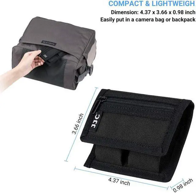 2 Battery pockets and 1 zipper Pocket-Compatible with AA AAA battery, LP-E6NH LP-E8 LP-E10 LP-E12 LP-E17 EN-EL14a EN-EL15a NP-FW50 NP-F550 NP-FZ100 DB-110 NP-W126 and more. Each zippered pocket can be used to hold SD/CF/XQD card Belt Loop-You can remove it without undoing belt. The touch fastener tape on the back of the pouch for mounting it to your belt. You can also put the pouch into your backpack for easy carrying.