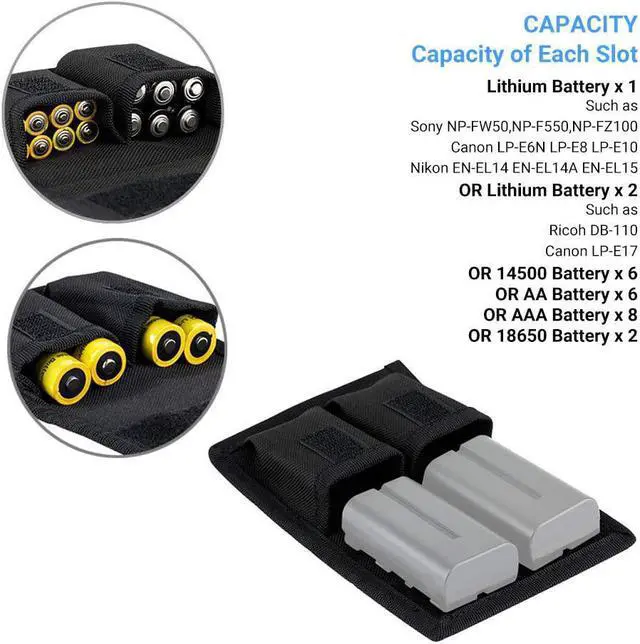 Note: memory card and battery not included. Capacity of Each Slot-Lithium Battery x 1, Or AA Battery x 6 / 14500 Battery x 6, Or AAA Battery x 8, Or 18650 Battery x 2 Quickly store the battery-The pouch features hook & loop closure for quick and easy opening and closing. Your travel will be much easier to carry the camera batteries. Protective Pouch-Our Battery Pouch is specially designed to safely and conveniently hold batteries for photographers. Made of high quality polyester material to protect from dust, moisture, scratches and damage.
