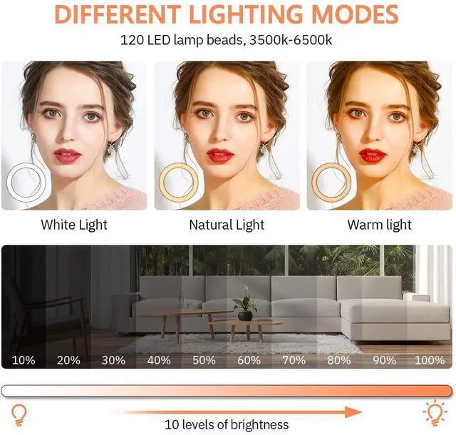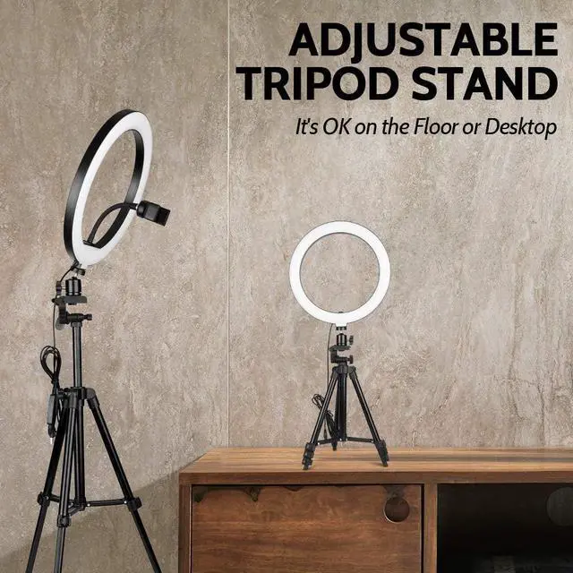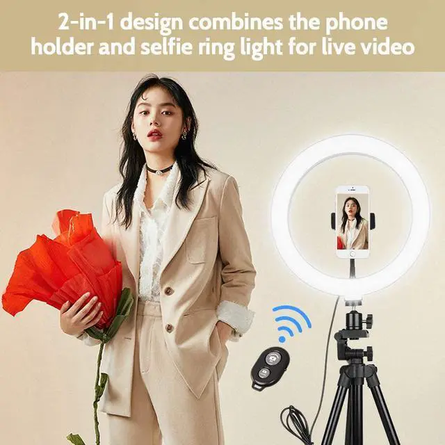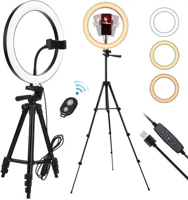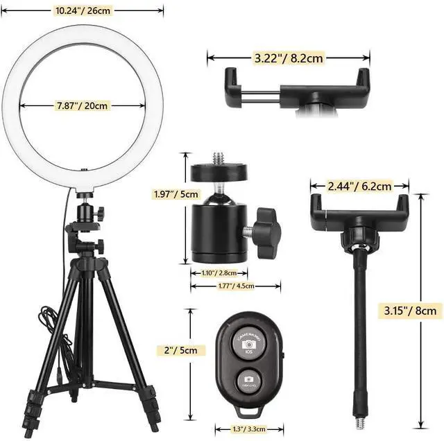 ???LARGE LIGHT RING? When you take self-portraits or live, the USB selfie ring light large enough for you to put your phone within it, ensured that captures the light will be uniform and the shooting effect will be better. The Bluetooth remote control function makes you easier to take selfies. ???3 COLOR MODES * 10 BRIGHTNESS LEVELS = 30 OPTIONS? ZUOCHEN’s 10" phone tripod with light contains 120 LEDs. The color temperature is adjusted from 3500K-6500K. It has 3 light color modes: Yellow Light/ Natural Light/ White Light. Each mode has 10 brightness levels, the intensity of brightness on a scale of 10% to 100% increases gradually. Choose the perfect light according to your personal shooting needs. ???ADJUSTABLE TRIPOD?The tripod is made of high-quality aluminum, light weight, stable and compact. With strong twist lock, the height of the tripod can be quickly adjusted from 13" to 41", and connect the LED selfie light ring can be reached 51". ???CONVENIENT USB POWER SUPPLY?The ring light for phone is a USB port, very low voltage lead to safe, most of electronic devices can power it, such as desktop computers, laptops, power banks, USB adapter, socket etc, very convenient. ???FLEXIBLE USE?The ring light with stand can rotate 360°, and the phone holder is flexible, allows you to adjust any shooting angles. The spring-loaded clip is designed to be compatible with 2.4" - 3.2" wide phones, such as for iPhone 11 pro/ iphone 11/ iphone SE/ HTC/ Samsung/ LG, etc. Suitable for all kinds of photography for you, such as sitting or standing, selfie or video, one person or multiple people.