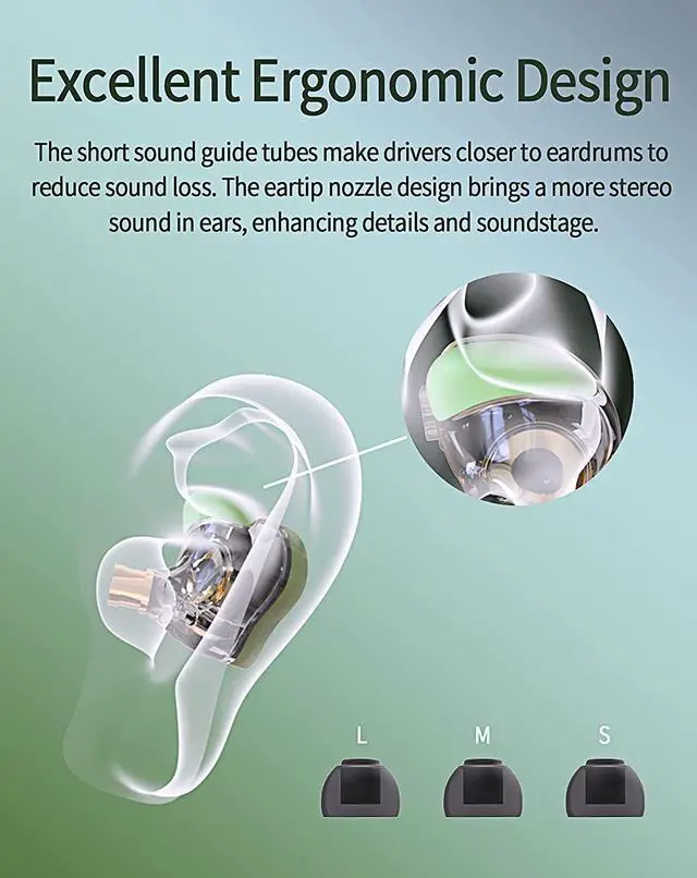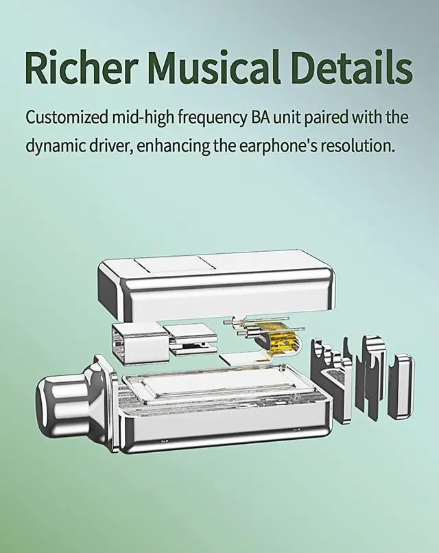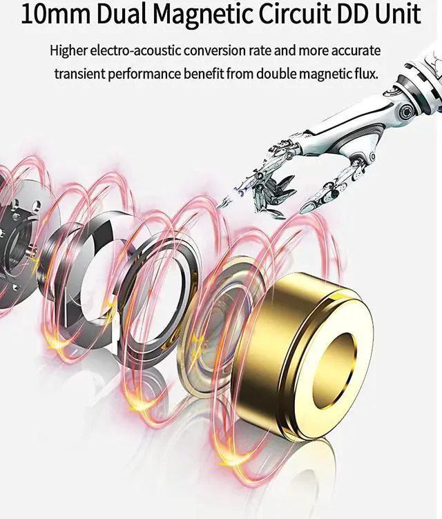 Superior Sound QualityThe sound is transparent and natural due to hybird units in overall, it also featured with low-frequency elasticity, sufficient quantity, mellow vocal, thick details, mild high-frequency, extensive sound and excellent separation. Suitable for people who listen to bass, vocals, pop, folk, and other styles. 10mm Dual Magnetic Circuit DD UnitThe electro-acoustic conversion rate of the double magnetic flux are higher than that of the ordinary DD units with the same specification. Low impedance and high sensitivity greatly improve the energy efficiency and transient response, presenting a deep and thick low frequency.