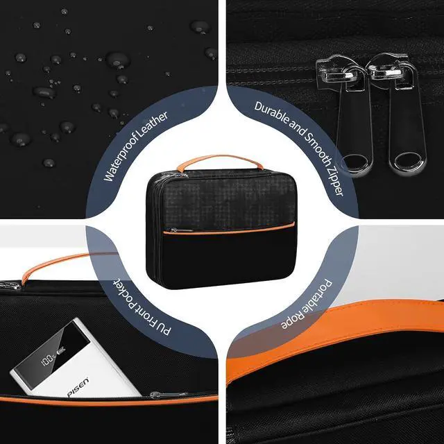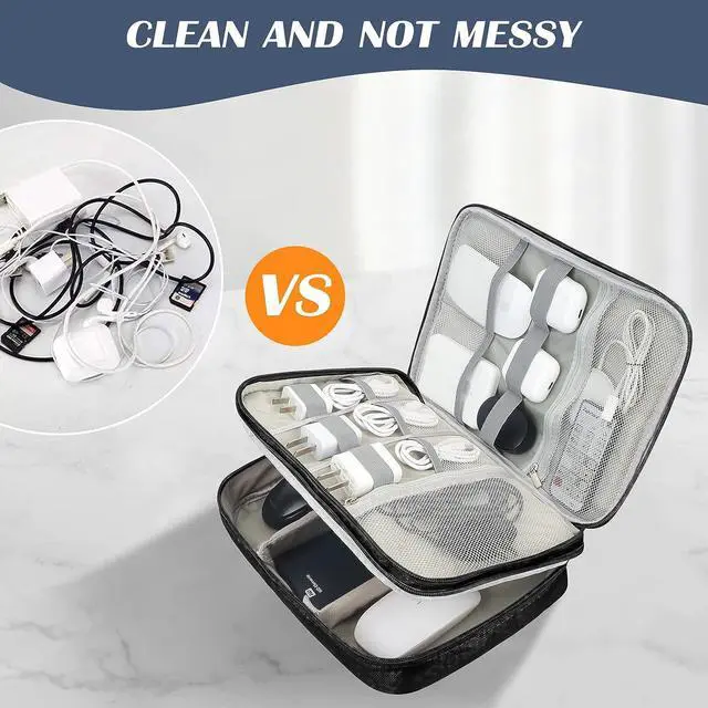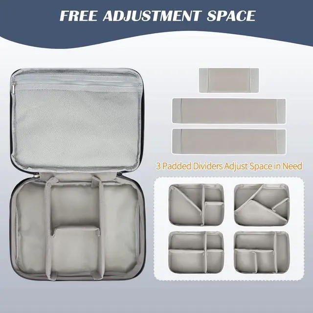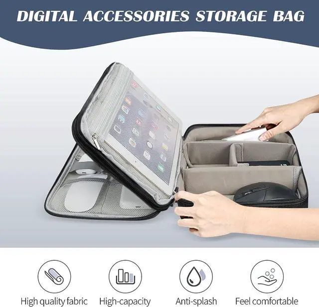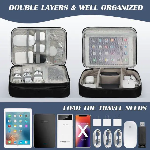 Practical Structure - The Size of the electronic organizer travel case: 11 x 8.26 x 3.54. The portable designed travel organizer bag provides 2 Layers interior compartment with double zipper opening, 1 front zipper pocket, 3 inner zipped mesh pockets, 5 small easy-to-access mesh pockets and 3 padded dividers for laptop chargers, cellphones, power bank, tablet iPad. Super Large Capacity - This travel electronics organizer has 2 layers with multiple pockets for organizing electronics accessories such as cords, cables, USB drive, cellphone, charger, mouse, flash drive, earphone and other accessories. With a large mesh zipper pocket for store tablet up to 9.7. Waterproof Material - This trvel cord organizer is made of waterproof PU leather and shockproof nylon material, soft sponge around to protect all the things inside against scratches, dust, impacts and accidental dropping. DIY adjustable compartment with 3 padded dividers - This travel cable organizer has 3 removable padded dividers, so you can design the layout as you wish to secure your gadgets in place and deliver a quick access whenever you want, a perfect case protects your electronics accessories. Travel Essentials - Compact size and lightweight make it easy to carry and put into your backpack and luggage.