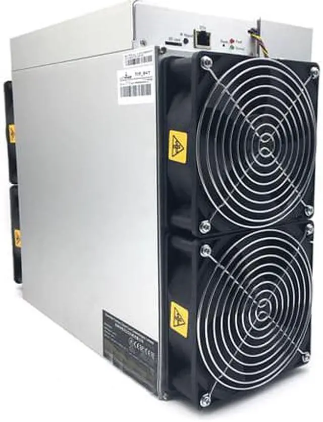 Model Antminer T19 (84Th) from Bitmain mining SHA-256 algorithm with a maximum hashrate of 84Th/s for a power consumption of 3150W.