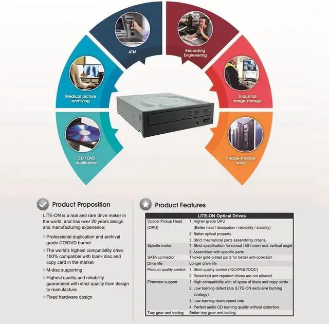 The Lite-On IHAS124 drive offers the SMART-BURN technology developed by Lite-On. It can automatically adjust the writing strategy & running OPC to provide the best burning quality and avoid Buffer Under Run error as well. Plus, it uses the Super AllWrite, which is the new compatibility standard from Lite-On which allows the DVD writer to write to any disc media: DVD+-R (W), DVD-RAM and Double Layer. Use your DVD writer for any purpose with the media you desire. Purchase your media without hassle; you no longer have to worry about compatibility! Perfect solution for CD/DVD duplication, medical picture archiving, ATM, Recording Engineering, Industrial Image Storage, Image Storage Array, and much more. All new DVD writers from Lite-On come standard with Super AllWrite, giving you a full range of options and applications for all your storing needs.