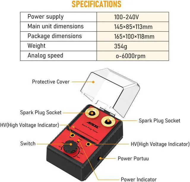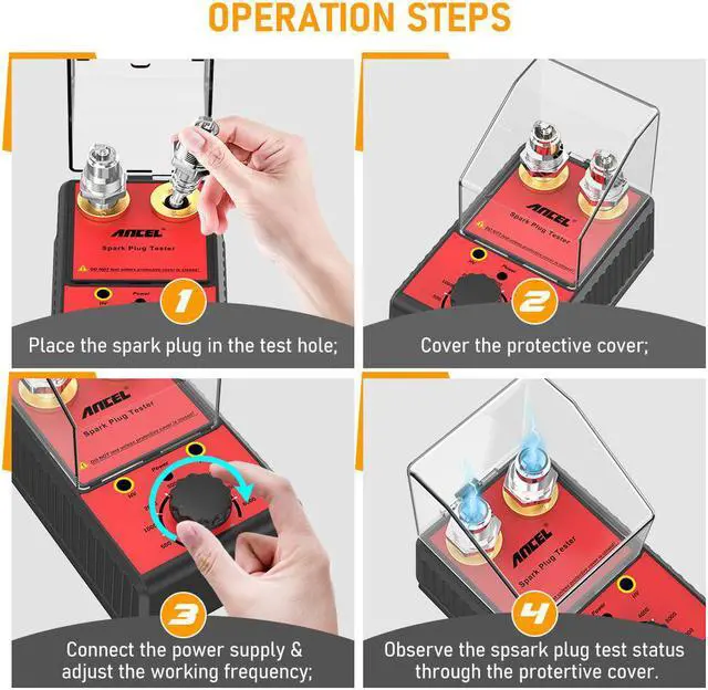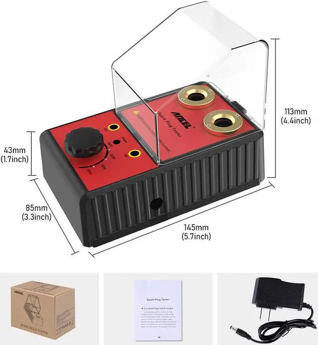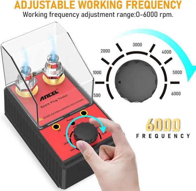 ProductFeatures: Dual Hole Testing & Protective Cover Protection 1. Spark plug tester has two spark plug socket, it can test two spark plugs (good spark plug & bad spark plug) at the same time. 2. By comparing the spark intensities of the two spark plugs, judge the performance and ignition intensity of the spark plugs, and replace the broken spark plugs in time. 3. The design of the protective cover can prevent you from the risk of electric shock during the test, which effectively guarantees your safety during the operation. 0~6000rpm Working Frequency Adjustable & More Accurate Data 1. By operating the rotary switch, you can adjust the working frequency in the range of 0~6000rpm, the higher the set frequency, the stronger the spark intensity. 2. Spark plug tester can also simulate the work of the engine, restore the authenticity of the car rotate speed, save time and high efficiency, and the data is more accurate, which can better test the spark plug. High-Quality ABS Material With Impact Resistance & Heat Resistance 1. high-quality ABS material, which has the characteristics of impact resistance and heat resistance.