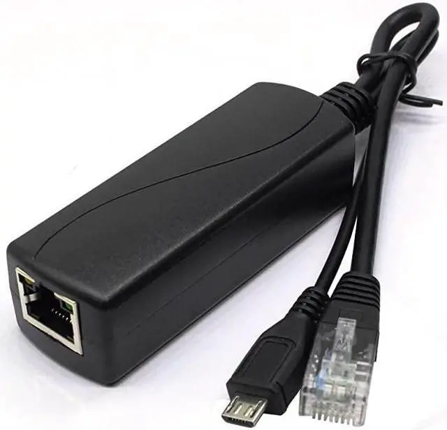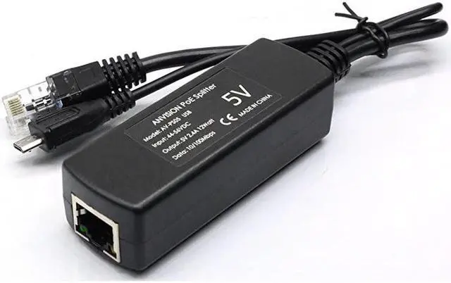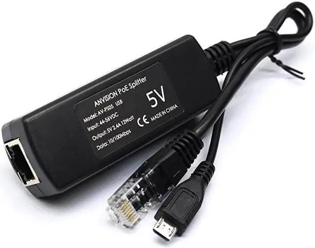 The Active PoE Splitter splits a PoE signal into an 5VDC power and 10/100Mbps ethernet data source. This device allows you to run ethernet cables from a POE Switch over long distance, and then split the PoE signal into a separate data signal and 5Vdc power sources in order to run an non-PoE devices.