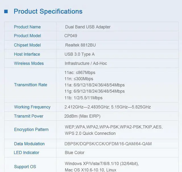 Maximum speed up to 5GHz 867Mbps or 2.4Ghz 300Mbps