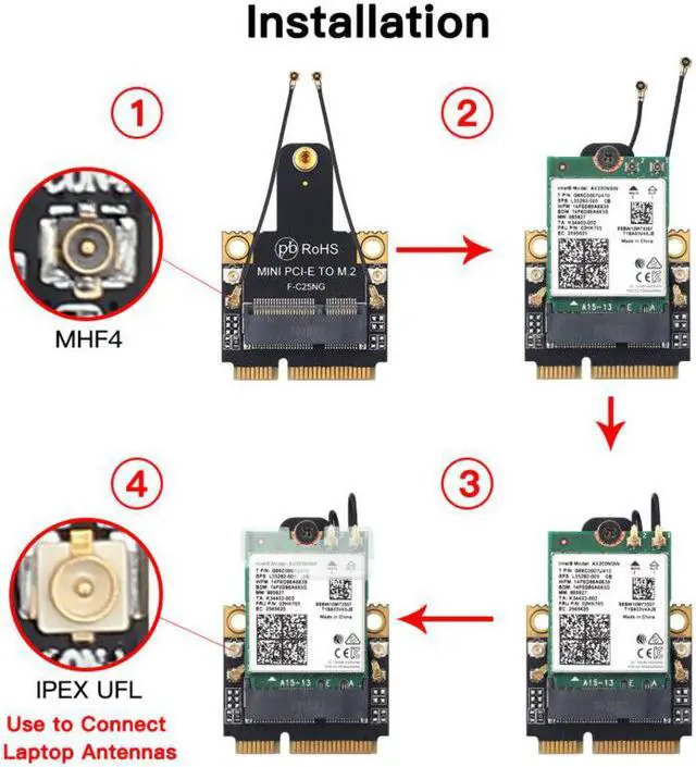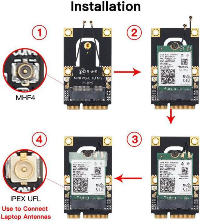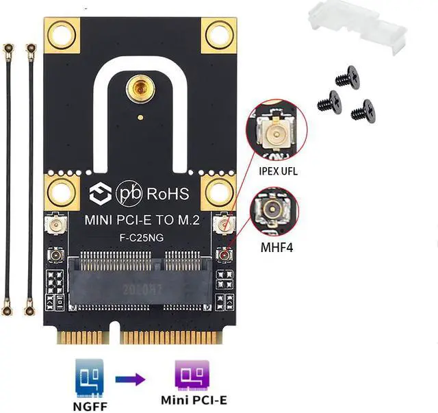 Note: Only support KEY A+E to PCI-E(The single Key E interface cann't be used),compatible with Wireless Wifi Bluetooth card, Such as AX200, 9260, 8265, 8260 and BCM94352Z, DW1560 NGFF(M.2) Wireless card, ect.