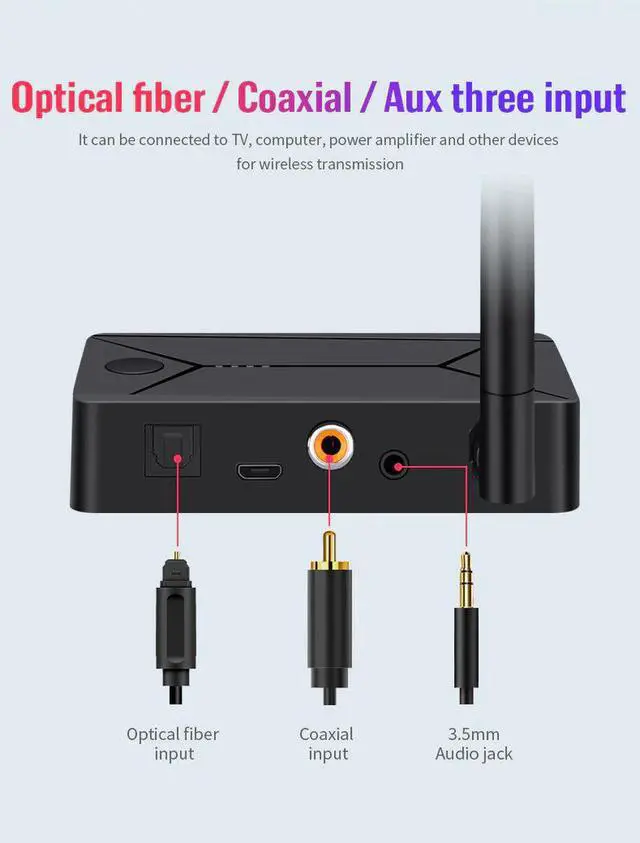 1: TX13 is a dual-purpose Bluetooth adapter with optical fiber. Coaxial. 3.5mm Bluetooth transmission and digital to analog. It uses USB5V power supply. When it is powered on, it enters the search and pairing state, and the red light flashes quickly. It can transfer music from mobile phones, walkman, TV, computer and other devices to your Bluetooth receiver, stereo Bluetooth headset, Bluetooth speaker and other devices wirelessly. 2: Can be directly converted into 3.5mm analog signal through the product optical fiber coaxial digital signal, optical fiber coaxial audio input 3.5mm output and speaker, power amplifier and other equipment connected by audio cable to achieve digital analog conversion.